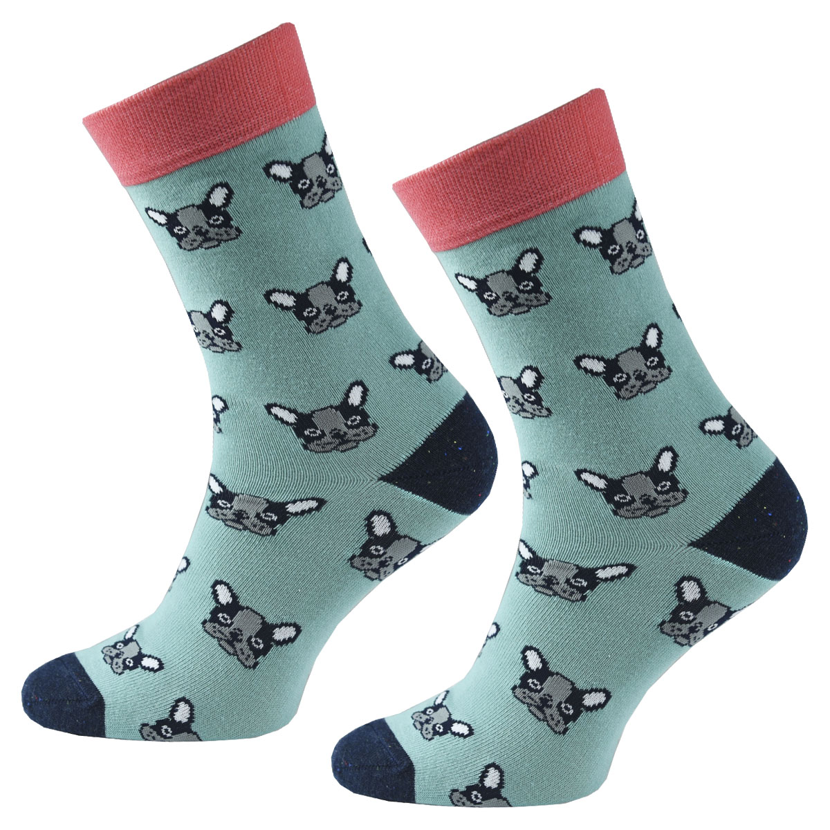 Te skarpetki to małe dzieło sztuki… z dużymi uszami! Miętowe tło, kontrastowe wykończenia i urocze mordki buldoga francuskiego sprawią, że Twoje stopy staną się główną atrakcją dnia – w biurze, na spacerze i na kanapie.